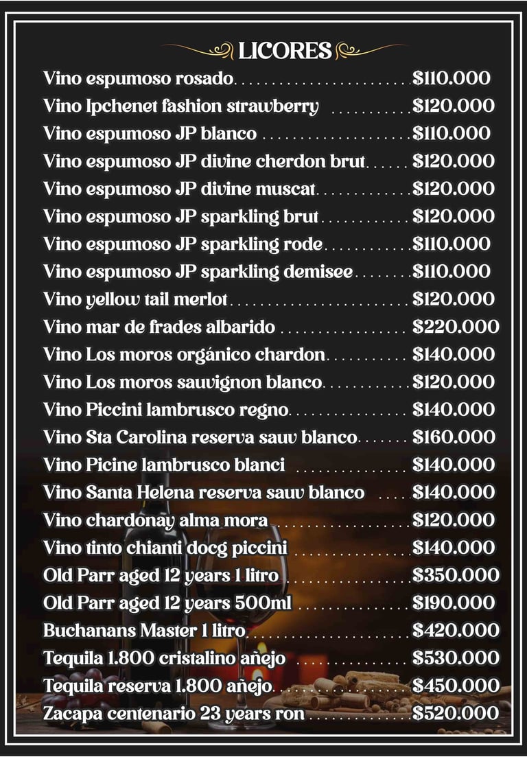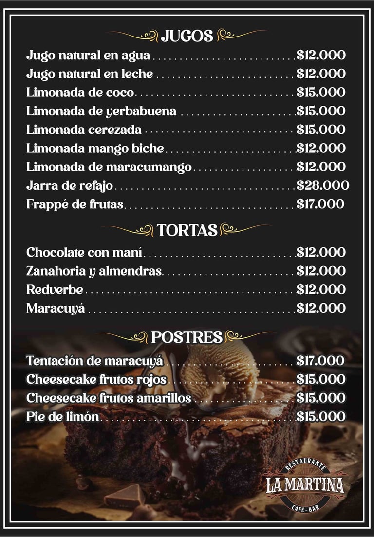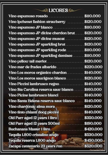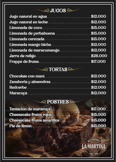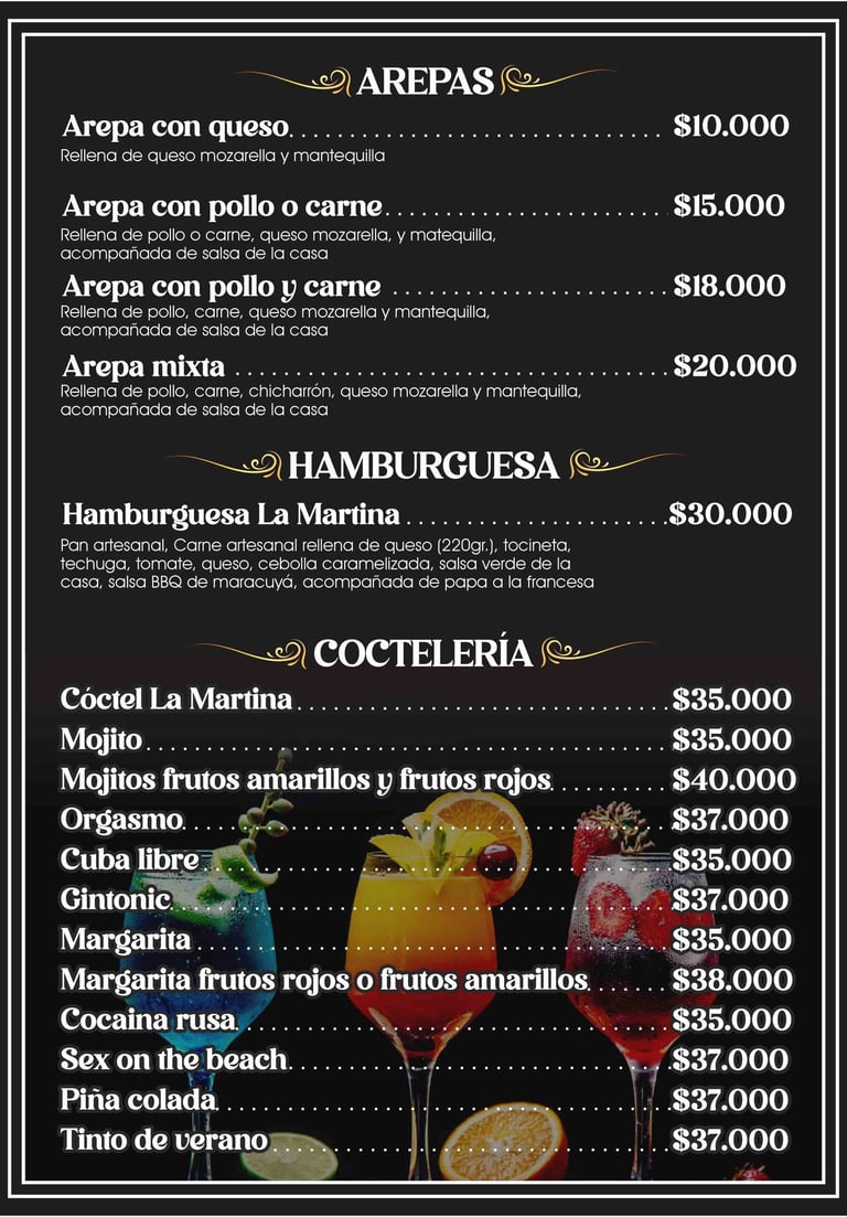 Nuestra COCTELERÍA es variada, incluyendo el Cóctel La Martina, Mojitos y Margaritas. Contamos con una robusta carta de LICORES , con whiskys premium, rones y vinos.