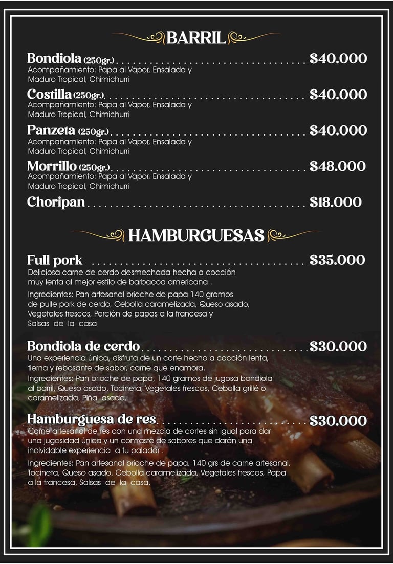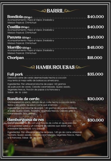 Nuestras especialidades de cerdo son las más buscadas: la Bondiola , la Costilla y la Panzeta. Para los amantes de la res, el Morrillo al barril es una experiencia de máxima ternura. Todos estos cortes se sirven con nuestros acompañamientos clásicos y chimichurri.