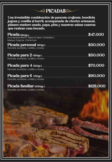 También ofrecemos el clásico Lomo de Res y opciones de Lomo de Cerdo. Si prefiere opciones más ligeras, tenemos Filete de Pollo y Chuleta de Cerdo. Para compartir, explore nuestras generosas Picadas.