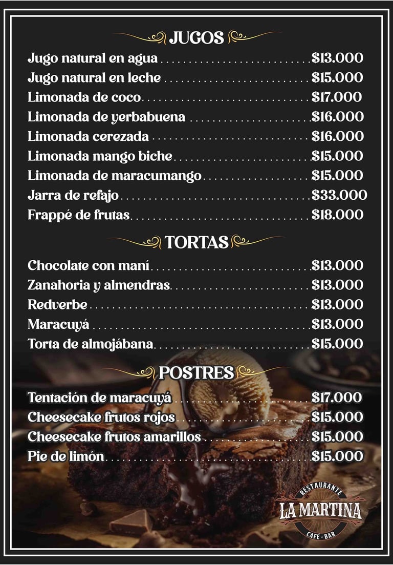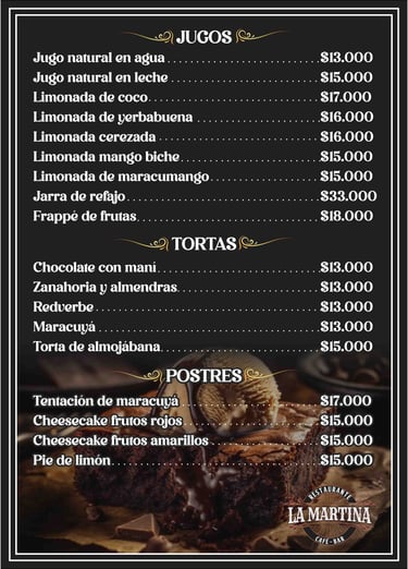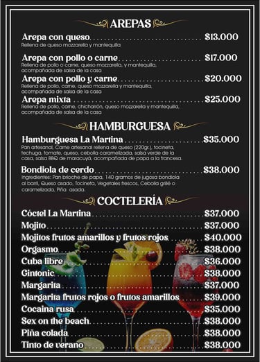 Nuestra COCTELERÍA es variada, incluyendo el Cóctel La Martina, Mojitos y Margaritas. Contamos con una robusta carta de LICORES , con whiskys premium, rones y vinos.
