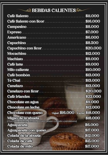 Somos un completo Café-Bar. Nuestra barra es tan variada como nuestro menú. Destacamos el auténtico Café de Origen Quindiano en múltiples preparaciones , como el Café Salento , Capuccino y Expreso. Pruebe también el reconfortante Migao de la abuela.