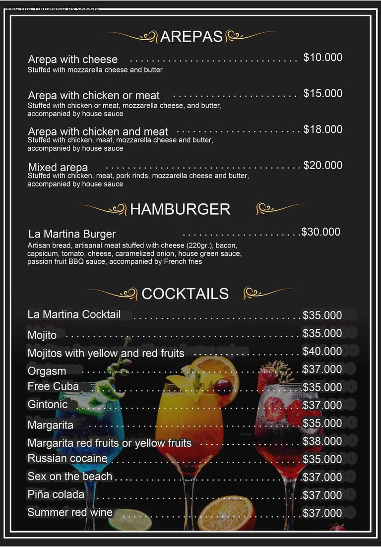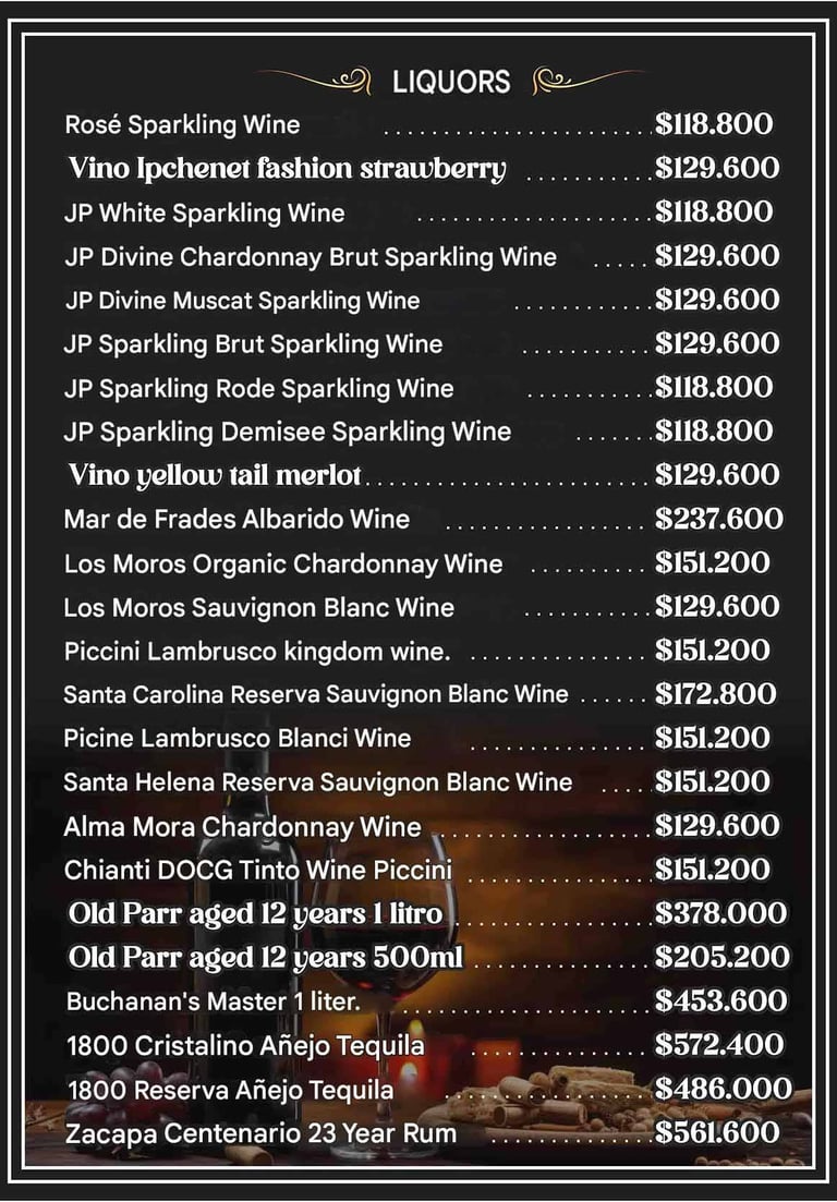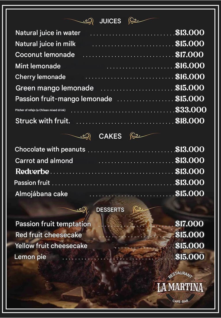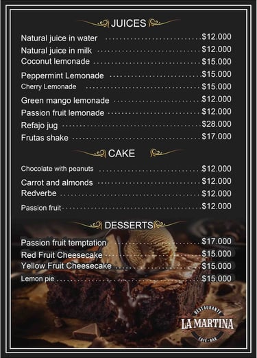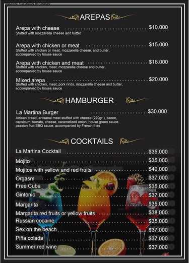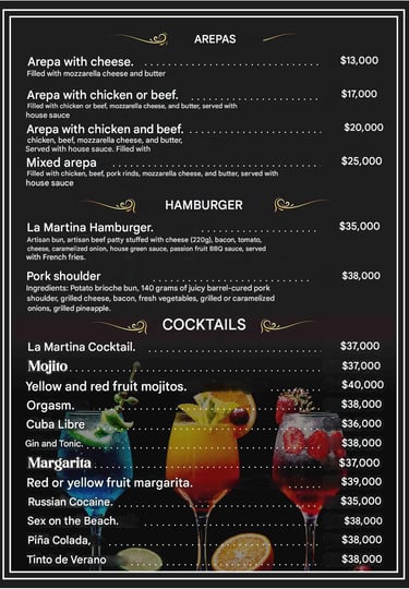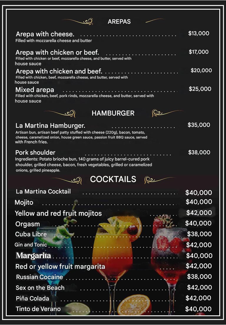 Our cocktail menu is varied, including the La Martina cocktail, Mojitos, and Margaritas. We also have a robust selection of spirits , featuring premium whiskeys, rums, and wines.