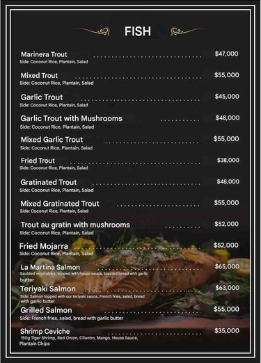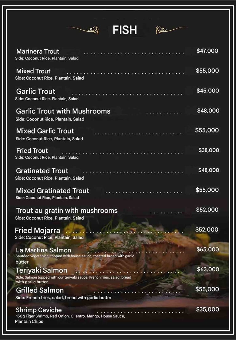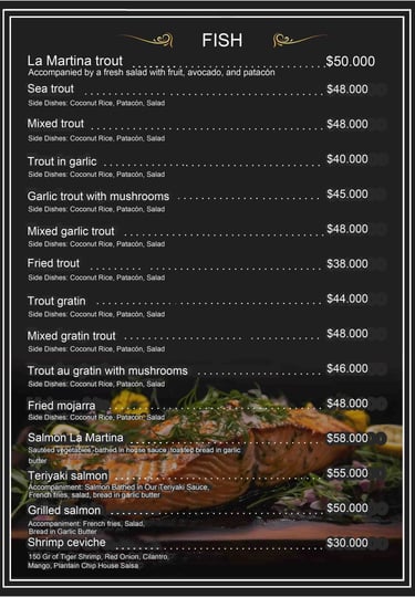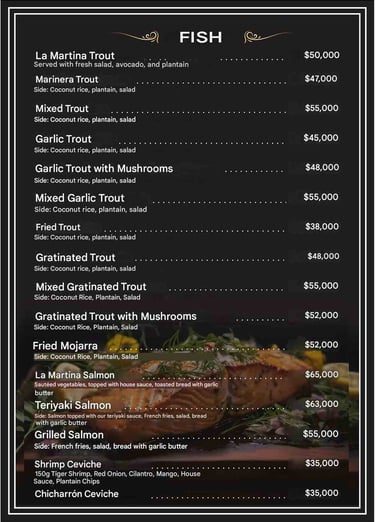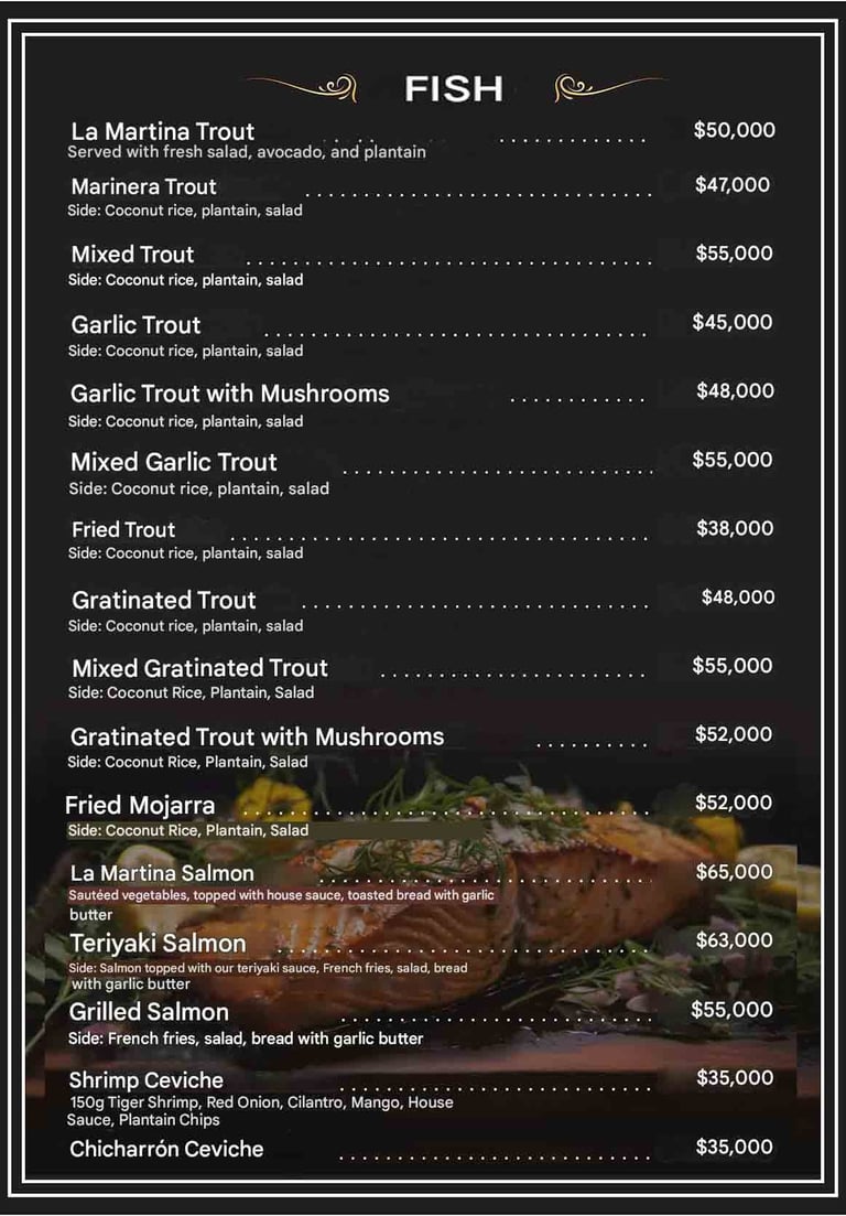 We are a seafood destination near Salento. Fresh trout is our star attraction, prepared in a variety of ways, such as our signature Trout La Martina marinara, garlic, or au gratin. We also offer salmon in teriyaki sauce or grilled. To start, try our delicious shrimp ceviche with mango.