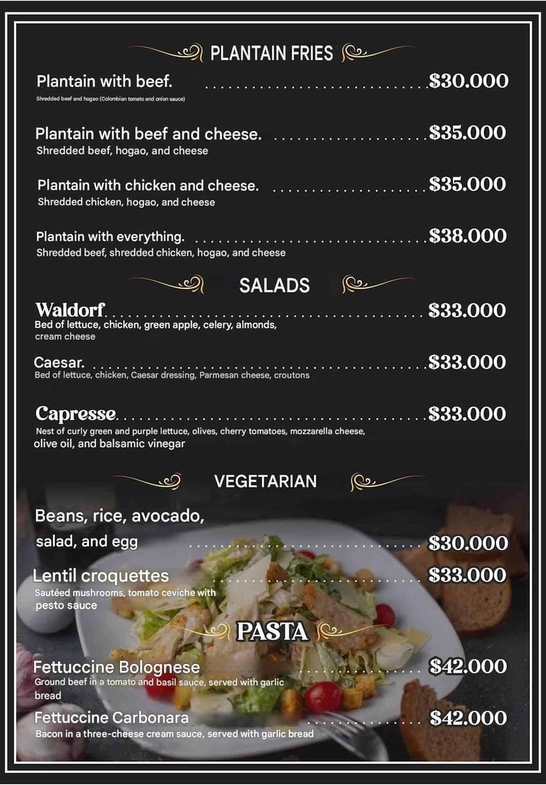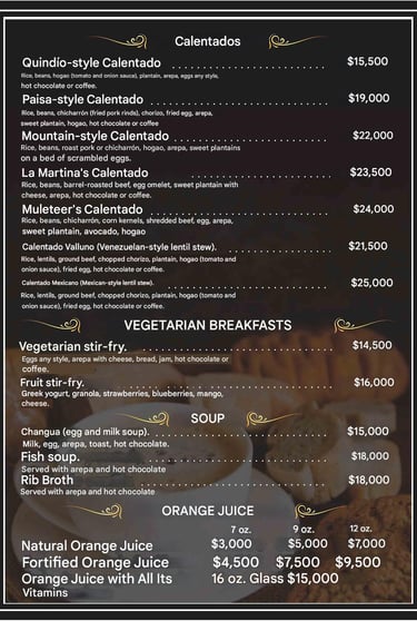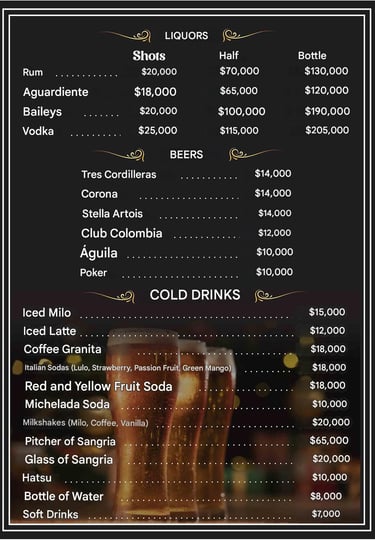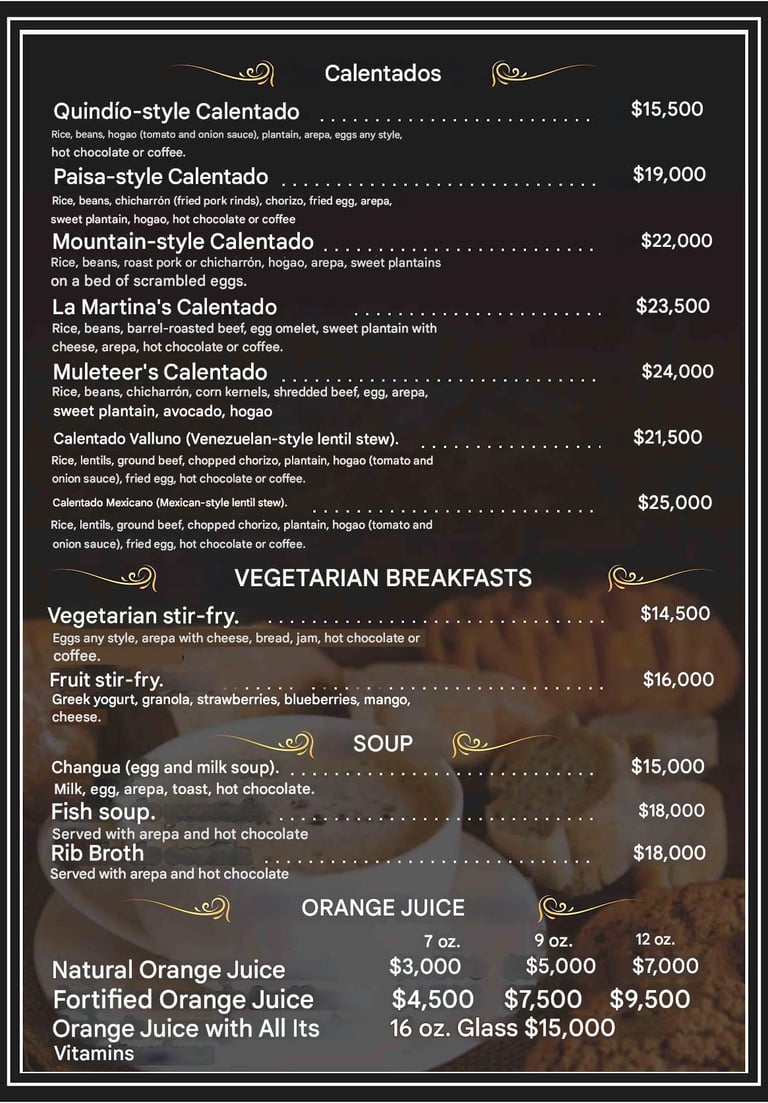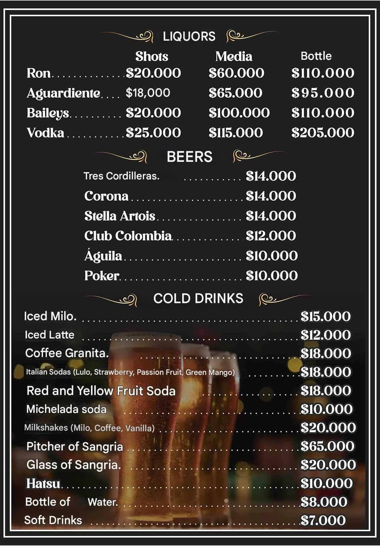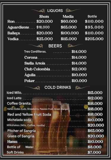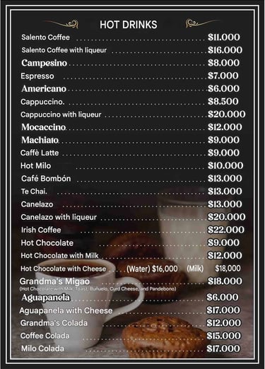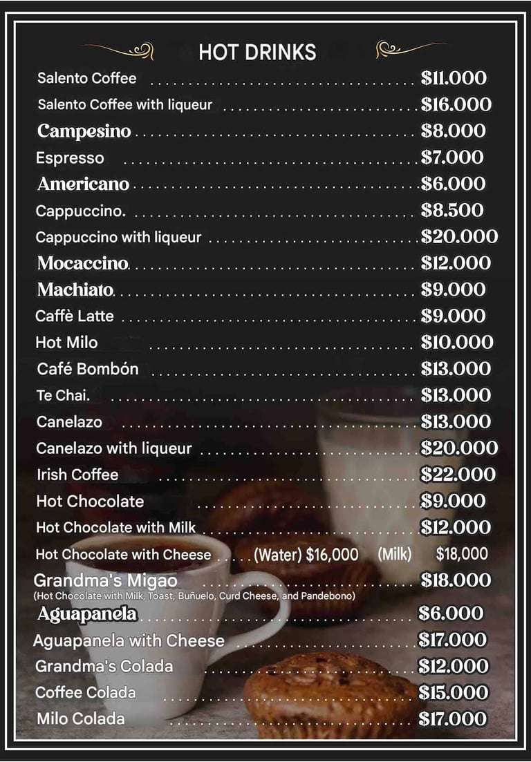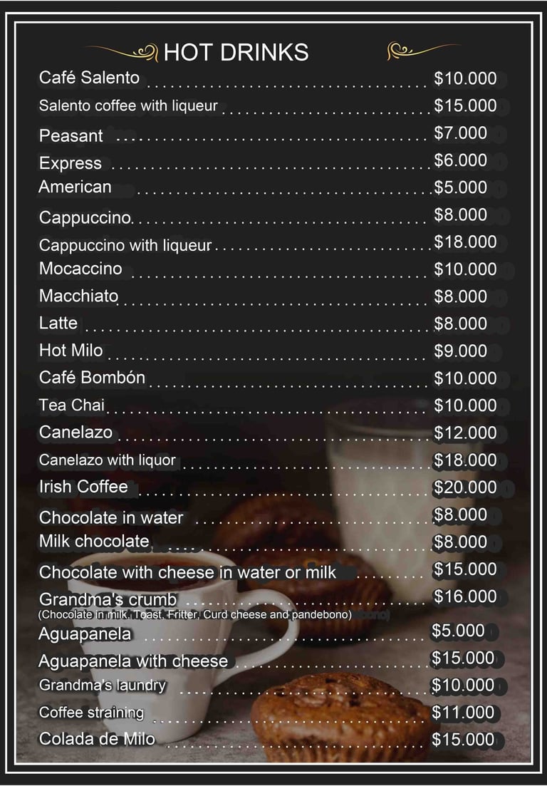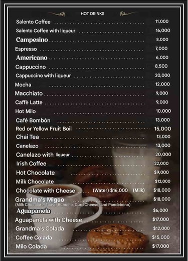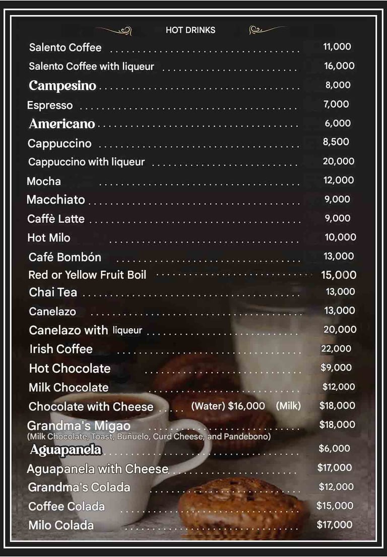 We are a full-service café and bar . Our bar is as varied as our menu. We specialize in authentic Quindío coffee prepared in many ways, such as Salento coffee , cappuccino, and espresso. Also, try our comforting Migao de la Abuela (Grandma's Migao ).