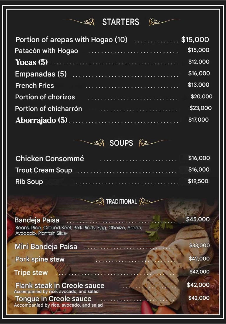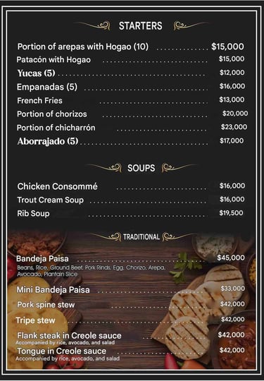 Our signature dish is the complete Bandeja Paisa . We also offer the comforting Sancocho de Espinazo and the traditional Mondongo . For heartier options, explore the Sobrebarriga or Lengua en Salsa Criolla .
