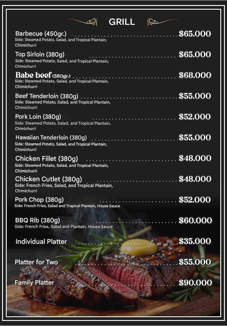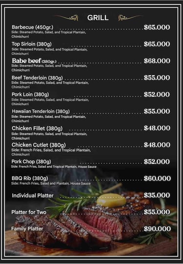 We also offer the classic Beef Tenderloin and Pork Tenderloin options. If you prefer lighter choices, we have Chicken Fillet and Pork Chop. For sharing, explore our generous platters.