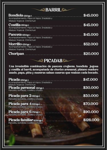 También ofrecemos el clásico Lomo de Res y opciones de Lomo de Cerdo. Si prefiere opciones más ligeras, tenemos Filete de Pollo y Chuleta de Cerdo. Para compartir, explore nuestras generosas Picadas.