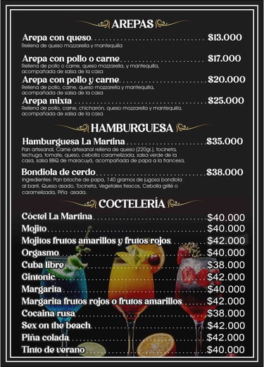 Nuestra COCTELERÍA es variada, incluyendo el Cóctel La Martina, Mojitos y Margaritas. Contamos con una robusta carta de LICORES , con whiskys premium, rones y vinos.