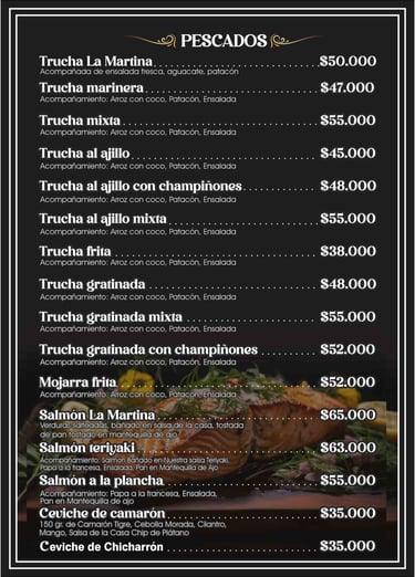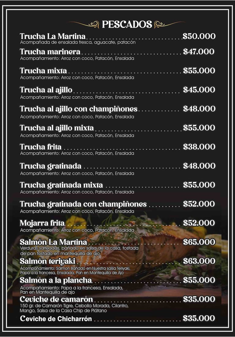 Somos un destino de PESCADOS cerca a Salento. La Trucha fresca es nuestra protagonista , con preparaciones variadas como la Trucha La Martina, marinera, al ajillo o gratinada. También tenemos Salmón en salsa teriyaki o a la plancha. Para iniciar, pruebe nuestro delicioso Ceviche de Camarón con mango.