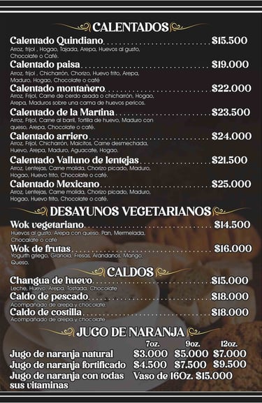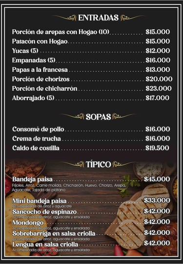 El plato insignia es la completa Bandeja Paisa. También ofrecemos el reconfortante Sancocho de Espinazo y el tradicional Mondongo. Para opciones más robustas, explore la Sobrebarriga o la Lengua en Salsa Criolla.
