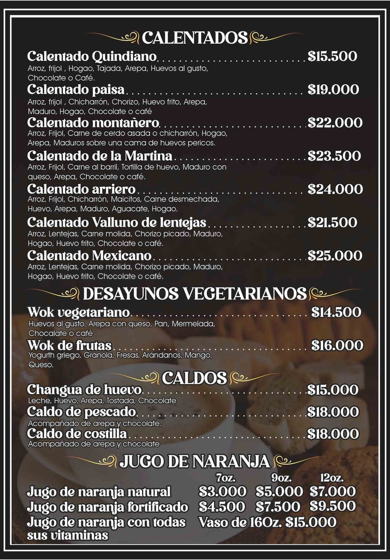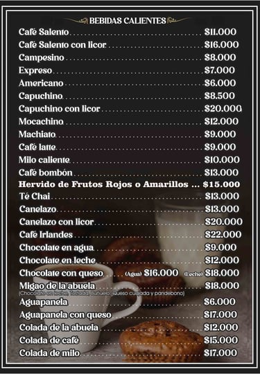 Somos un completo Café-Bar. Nuestra barra es tan variada como nuestro menú. Destacamos el auténtico Café de Origen Quindiano en múltiples preparaciones , como el Café Salento , Capuccino y Expreso. Pruebe también el reconfortante Migao de la abuela.
